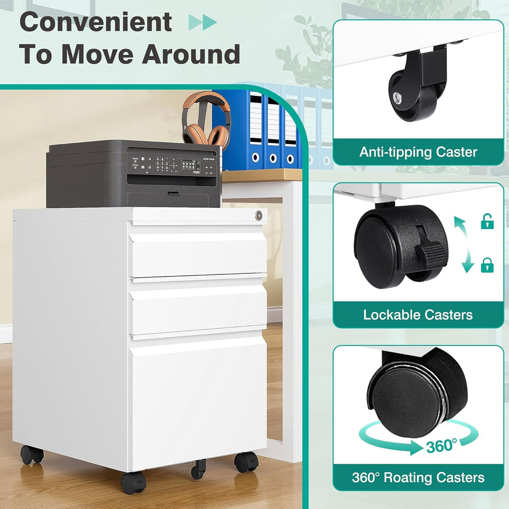 ✔️【MOBILE DESIGN】: 3 drawer metal file cabinet with lock equipped with 360-degree rotating wheels and lockable casters for smooth mobility,one center caster to prevent tipping,perfect for under-desk storage or moving between workspaces