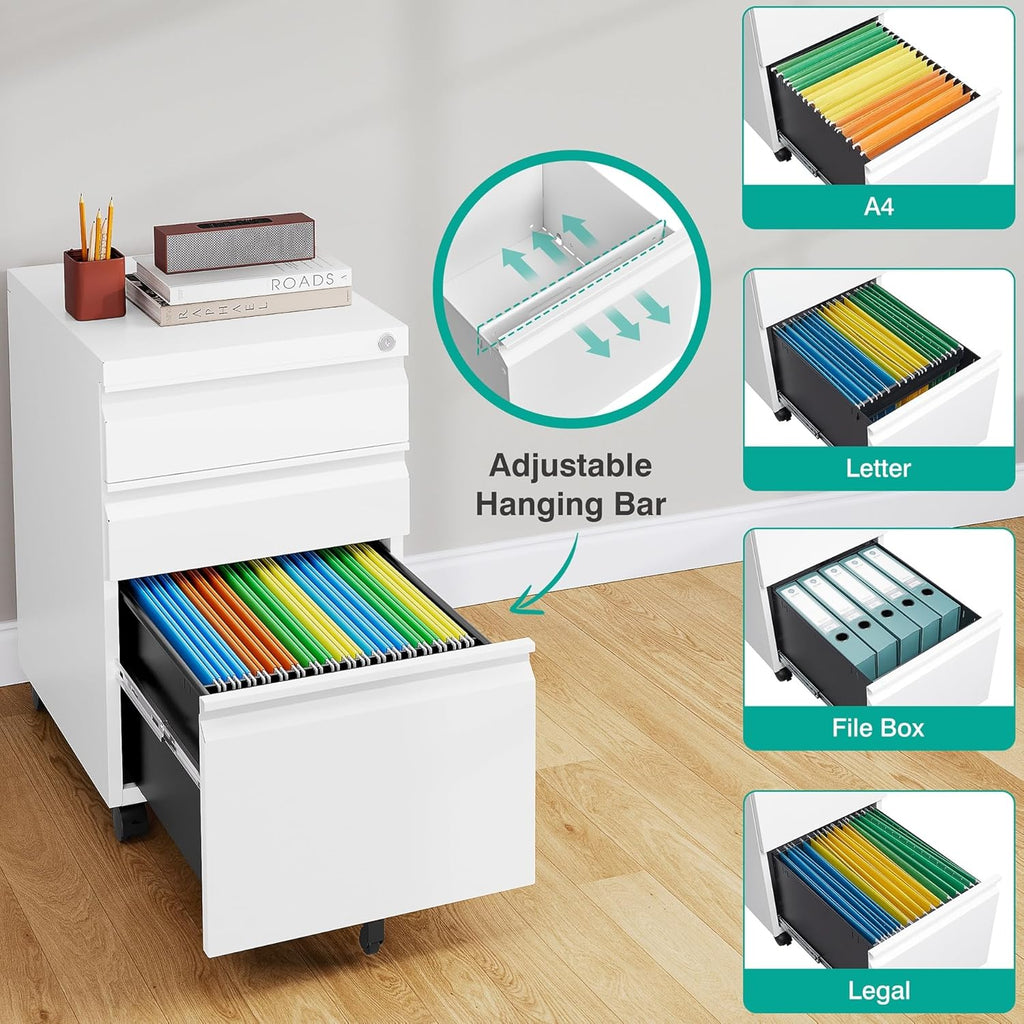 ✔️【FULL EXTENSION】: Office file cabinets equipped with removable hanging bar, supports letter size, legal size and A4 hanging file in both drawers. Three drawers with smooth-gliding rails that extend completely,allowing easy access to files and documents.