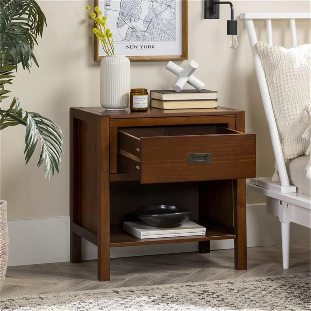 Find open and closed storage all in one sophisticated unit with this solid wood nightstand. This bedside table includes a lower cubby and a top drawer with wood on wood runners, a finished interior, and a pull-out metal handle that lays flat when not in use. Reminiscent of a mid-century filing cabinet this updated end table provides a retro chic flair, making it a fabulous addition to any room whether the decor is Parisian, eclectic, or modern.