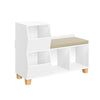 Our RiverRidge Kids Catch-All Multi-Cubby Storage Bench is the ideal kids bench, making a superb spot for reading, playing, and stowing away books and toys. It features two storage compartments on the left and two square cubbies below the bench seat, allowing children to load it up with stuffed animals, building blocks, toys, books, and more. The beige bench cushion adds a cozy place for children to sit while they read or play. With a clean, white painted finish and solid pine wood feet, our children's bench is the ideal solution for tidying up kids' play rooms in style. To conceal the clutter and add a pop of color to your space, pair it with a two-pack of our colorful RiverRidge folding fabric storage bins (sold separately). It is made of MDF with a painted finish and can hold up to 150 lbs. Includes detailed instructions and wall-anchoring hardware for easy assembly and installation, giving you peace of mind regarding your child's safety.